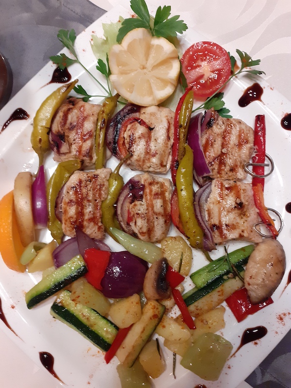 Gyros, Souflaki, Bifteki, Calamari, Lammkotelett dazu Scheibenkartoffeln oder Pommes
